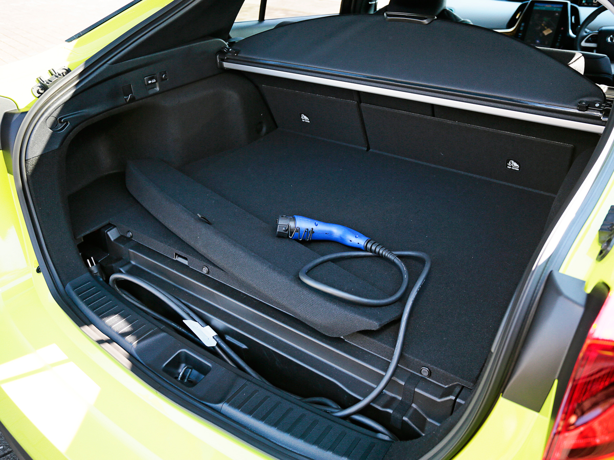 バッテリー容量以外では、プリウスPHVとプリウスの、機構面での違いは大きくふたつ。ひとつは、プリウスPHVには外部からの給電に対応するために、充電装置が追加されていること。プリウスPHVは、100V電源(6A/充電時間は約14時間)、200V電源(16A/同約2時間20分)のほか、急速充電にも対応しています(約20分で約80%まで充電)。