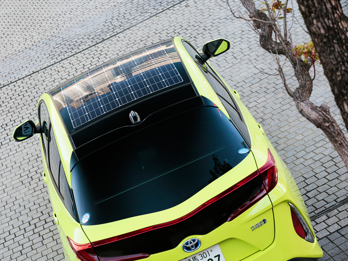 目に見える“先進性”をさらにアピールするには、ルーフに太陽電池を敷き詰めた“ソーラー充電システム”がオススメ(「S ナビパッケージ」と「S」にオプション装備/28万800円)。最大で6.1km分の電気が太陽光から得られます。