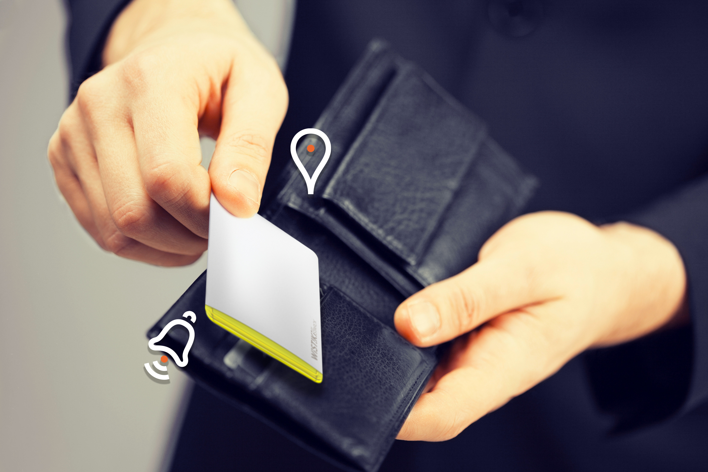 5.電子リード:Wistikiとアプリの間のBluetooth通信が途切れると、スマートフォンにメッセージが表示されます。犬の散歩用リードのように持ち物とスマートフォンの距離を一定に保つことで、置忘れ防止に役立ちます。