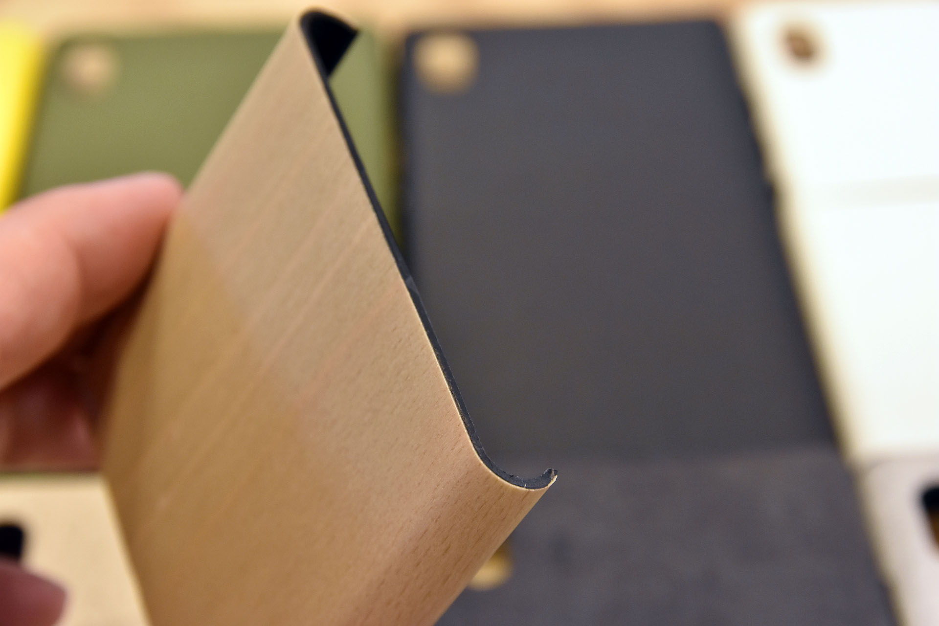 星川:この外装にもすごく大きな分かれ道がありました。カバーが「Uの字型」になっていて、付け替えができるようになっています。これはインモールドラベリング(IML)という製法を使っていまして、プラスチックの樹脂を金型に流し込むんです。カバーに使ったクラレのクラリーノや、東レのウルトラスエード、そしてテナージュという本物の木ですね、これらを挟み込んで、樹脂を入れるんです。