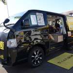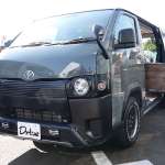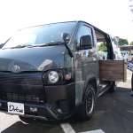 ブラックボディとボディサイドのステンシル、そしてタイヤのホワイトレターがクールなケイワークスのナローハイエース。標準ルーフの上には、エレベータールーフが架装されています。