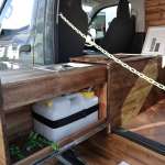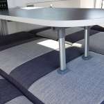 運転席後方は横向きソファになっていて、しかも中央のテーブルを挟んで対面で座ることが可能。ベッド展開する際はソファの間にマットを敷くだけ。大掛かりな作業が不要なので、たとえば雨の日でもクルマの外に出て作業する必要がありません。