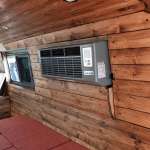 インテリアは側面と天井にリアルウッドを貼って、高級感を演出。フロアはフローリング仕様になっています。側面についた車載クーラーはオプション(45万8000円)になります。