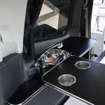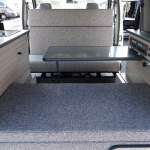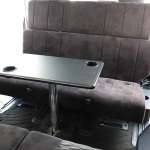 セカンドシートはケイワークスが開発したスライド機構付きのREVOシートを装着。このシートを折り返して、3列目と対面にできます。対面時に使うテーブルは、使用しないときはバックドアに収納できるようになっています。