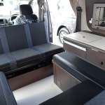 セカンドシートは停車時には後ろ向きに展開可能。ラゲッジ部分にマットを敷けば、コの字型のダイネットを作れます。ダイネット中央には着脱式のテーブルを設置できます。