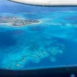 「与那国島からの復路、西表島上空を通過して小浜島(左上)付近に差し掛かると、眼下にサンゴ礁が一気に広がります。石垣島と西表島の間は石西礁湖と呼ばれ、日本最大規模のサンゴ礁海域。その青さは圧巻! 高度も低くめちゃくちゃ感動しますよ」