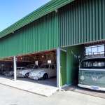 ▲ハイトのあるVW タイプⅡはガレージの外にて保管。カーポートの高さ3600mmに対して半分の1800mmをガレージの開口としていることが分かる。ガレージのサイドに付けられたドアは、人工芝を貼るなど目立たないように。ガレージの前にもクルマが出入りするためのスロープが設けられた