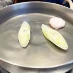 ガスコンロが着火され、鉄鍋が温まったところで、まず牛脂を伸ばし、その上に千住ネギの風味を油に広げます。そこに牛肉を加え、千住ネギの甘みを肉全体にまとわせながら火入れしていき、程よい加減のところで割下をかけます。