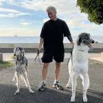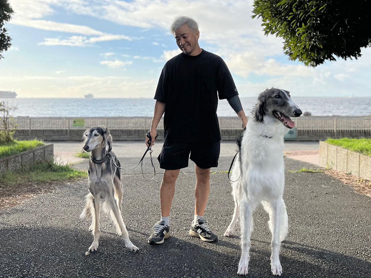 僕の今の愛犬は、大型犬のボルゾイとサルーキですが、もちろん彼らとの散歩は日課です。毎日早朝から5kmくらいお散歩します。いやお散歩というか、一緒に走ることが多いですね(笑)。だって、速いほうが喜んでくれますし。