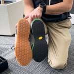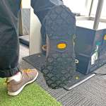 ▲右足に別のテクノロジーを装着して、濡れた氷上を体験中