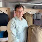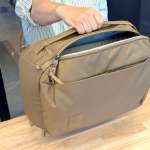 いろいろな人に話を聞き、縦型のバックパックであっても片方の肩に掛けたりキャリーケースに載せたりして横向きになったバッグの中を探ることが多いことを知ったケビンは、横向きにしても型崩れせず、その状態で取り出しやすいようポケットの位置や向きを配置。PCスリーブは吊り下げ式で、縦横どちら向きにしても衝撃が加わりにくくしています。