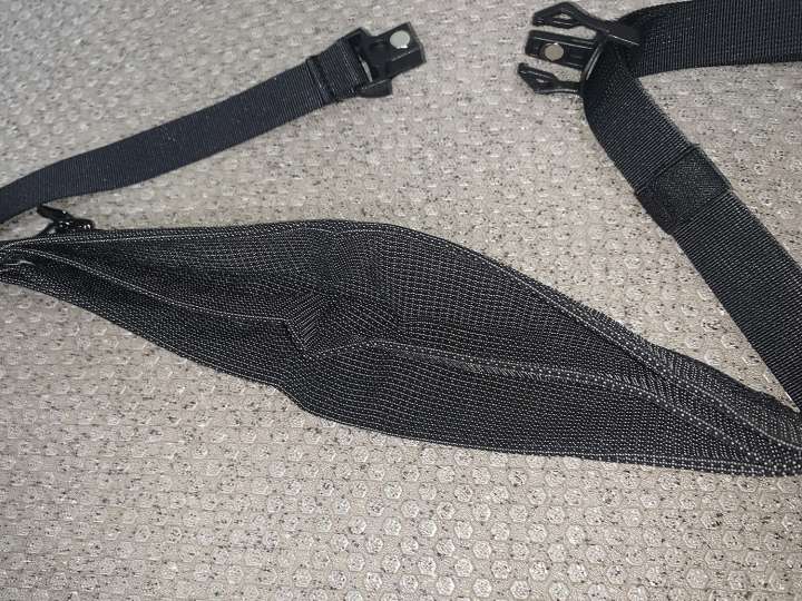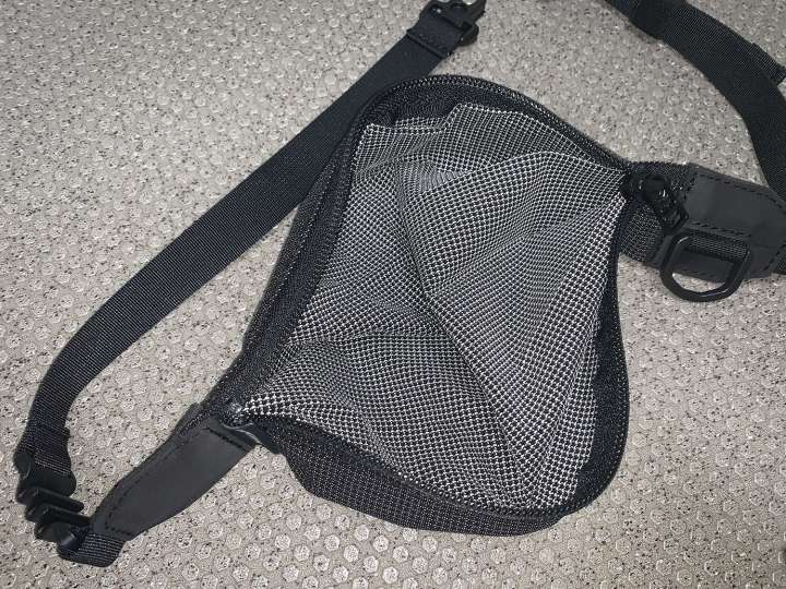 本体部は蛇腹(ジャバラ)状に折り畳まれており、広げると見た目以上の収納力。通常の形状は、バッグというよりはむしろベルト状の形をしており、ベルトループにも通せるくらいの太さなので、もちろんベルトとしての使用も可能。