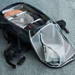 先程同様、フロントローディング式で大きく開閉し、スーツケースのように整理できるのが特徴。内部には荷物を押さえるコンプレッションベルトを備えており、パッキングキューブをまとめても崩れにくい構造です。
