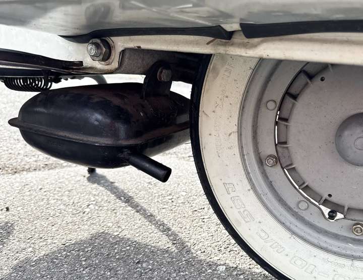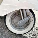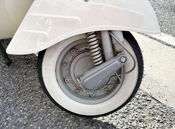 ▲フロントの足回り。ベスパの「鉄スクーター」モデルに共通する片持ち式です