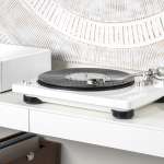 本体色はブラックのほかフレッシュなホワイトカラーを展開するが、独特な形状をしたダストカバーがそのままレコードジャケットを飾るスタンドとして使えるなど、レコード好きを楽しませる“隠し味”が多いのも特長だ。