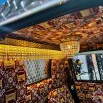 ▲「ハイゼット・トラックPTOダンプ大発命」のインテリアは歴代ハイゼットのフロントマスクをプリントしたモケット張りで、シャンデリアと、特注のナイアガラを装備
