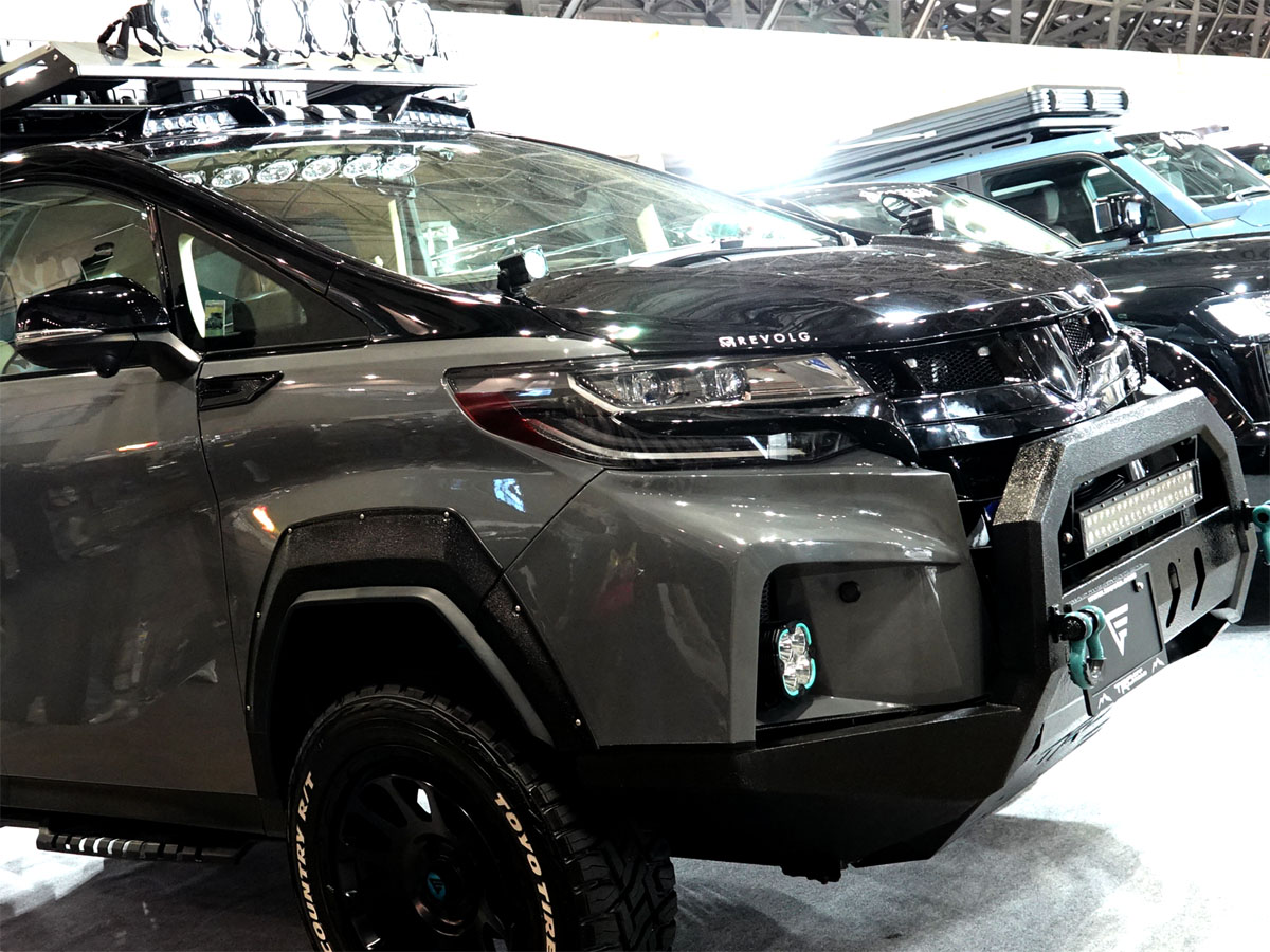 グレーとブラックの2トーンボディにラプター塗装されたオーバーフェンダーとバンパー。これはランドクルーザーやハリアーなどラグジュアリーSUVのカスタムを得意とするGMGが手掛けたモデル。オートサロンでもランクル250やランクル300と並ぶ形でこのクルマが展示されていました。