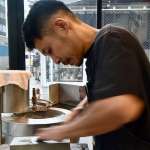 「握り心地は1番の決め手になります。当店では、売り場のまな板素材の天板の上で実際に包丁を握って動かし、重さやバランス、ハンドルの形が自分に合っているのかを必ず確認していただきます。刃と柄のバランスや重さは包丁ごとに全然違うので、確認したうえで自分にピンと来るものを選んでいただいていますね」