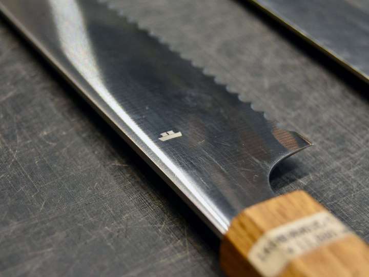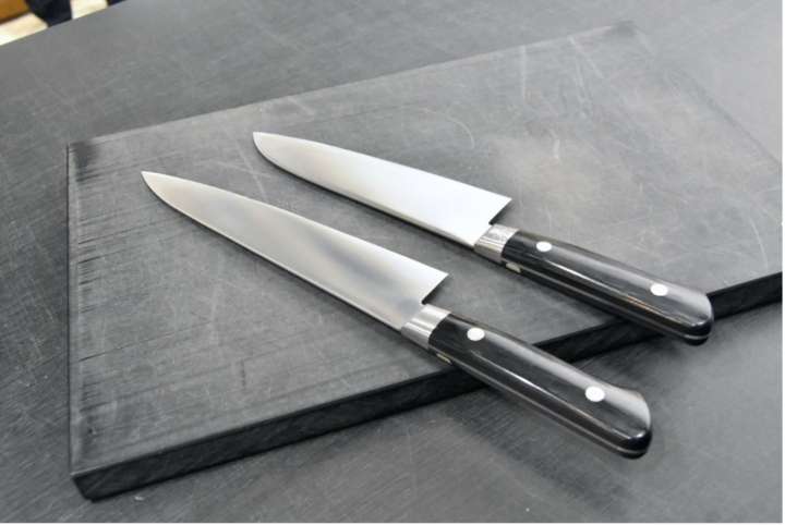 ▲三徳包丁と比べ、刃が少し長く切先が尖っているのが、牛刀。中にはプロの料理人が使うような刃渡り30cmのものも