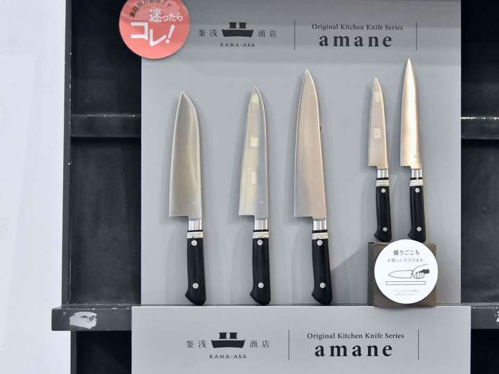 肉や魚、野菜などオールマイティに切ることが出来る「三徳包丁」は、幅広い料理に対応できるので、まずは1本持っておくと便利で頼れる存在。ちなみに『釜浅商店』オリジナルの洋包丁シリーズ「amane」三徳包丁は、素材と形にこだわりがあるのだそう。