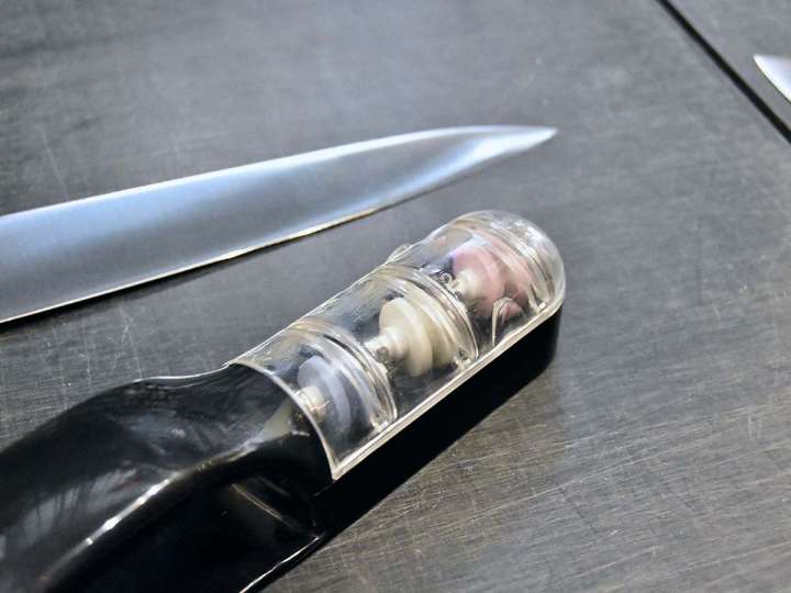 「普段のお手入れは錆びないよう、洗った後はしっかりと水気を拭いて、包丁差しなどに保管を。刃のメンテナンスは包丁研ぎですね。一番のおすすめは砥石で研ぐことですが、切れ味が落ちるたびに研ぐのは大変ですよね。そんなとき、まずは簡易的なシャープナーを使ってみてください。当店では水を入れて三段階(粗目、中目、仕上げ)で仕上げる研ぎ器があり、砥石と同じような役割をするので、結構きれいに切れ味が戻ります」