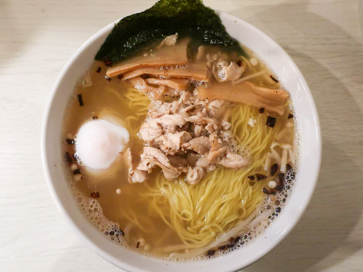 ロケーションは、長堀橋にある雑居ビルの2階。マニア心をくすぐる隠れ家的な立地でありながら、営業時間中は行列が絶えないほどの人気ぶりを誇る。私がオーダーした「ねぎ塩」は、キレとコクを見事に兼ね備えたスープが、会心の出来映え。