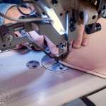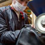最後の仕上げが“バフがけ”と言われるもの。革用ワックスを塗布し、機械で表面を磨き上げることで光沢や手触りに変化を与えると同時に、色止めの役割も担っています。この工程で使用する機械は、一般的な靴磨き用と比べてバフ(磨く部分)の幅が広い特注品。