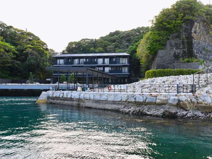船がついたのは美しい海と島の緑に包まれた温泉宿。この地で愛されてきた「ホテル中の島」が高級和風リゾートとして生まれ変わった『熊野別邸 中の島』は、新しいながらも伝統を感じさせる落ち着きある佇まいでした。