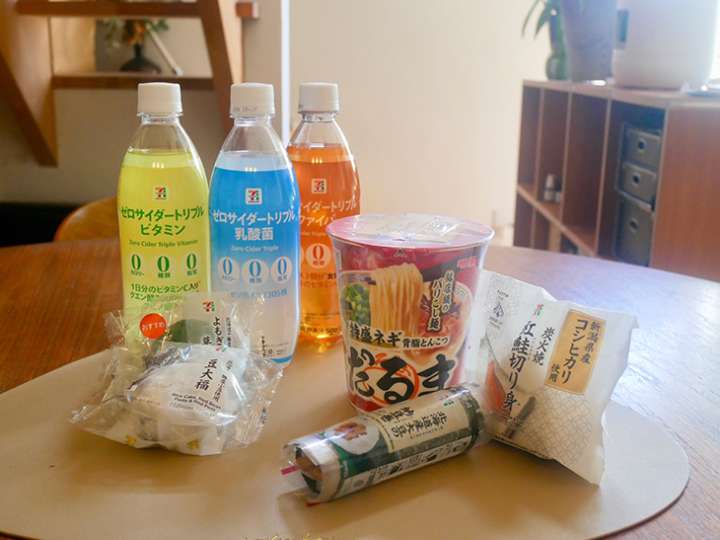 ▲例えばカップラーメン「だるま」にゼロサイダー。さらにたんぱく質のサラダチキンなどを組み合わせるとバランスいい食事に