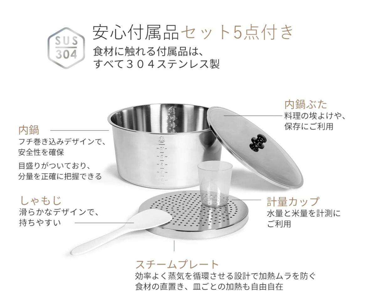 ▲炊飯と蒸し料理が同時にできる付属品もセット。もちろん、炊飯や煮込みだけもできるので、一台あればかなりの料理がまかなえる