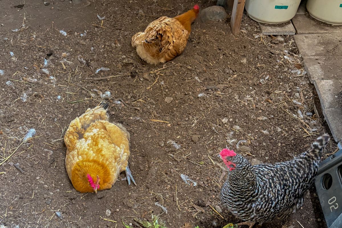 ▲砂のくぼみに座り、羽根で砂を散りばめるように全身で砂浴びする鶏。これで体の汚れや余分な脂を落とし、寄生虫を落とす役割があるそう