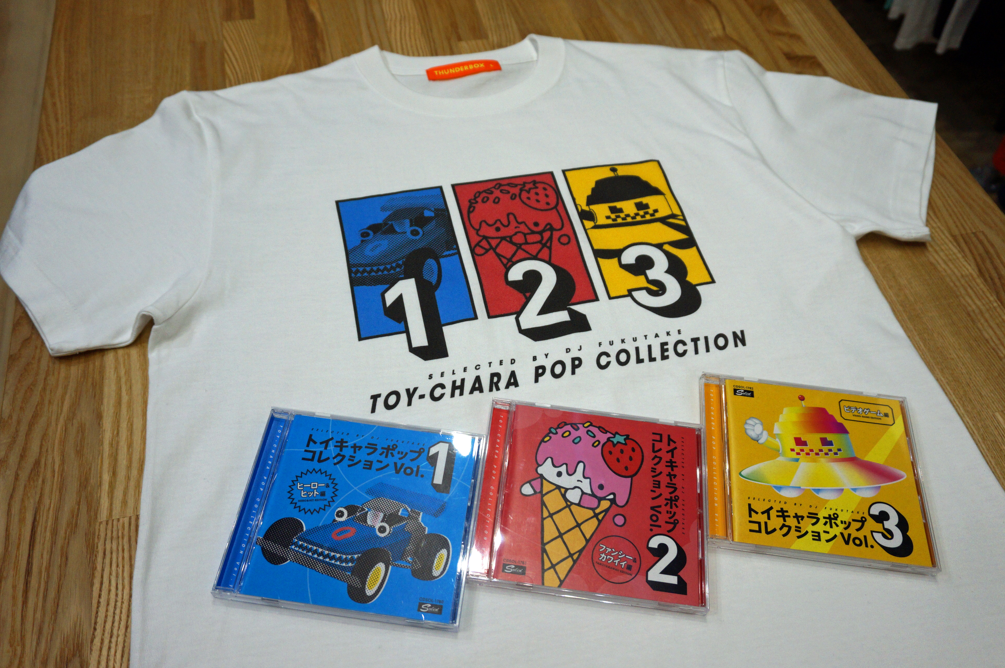 ▲DJフクタケ×謎の店のコラボアイテムその1。CD3枚のジャケット・イラストが合体!した「トイキャラポップ・コレクション」Tシャツ