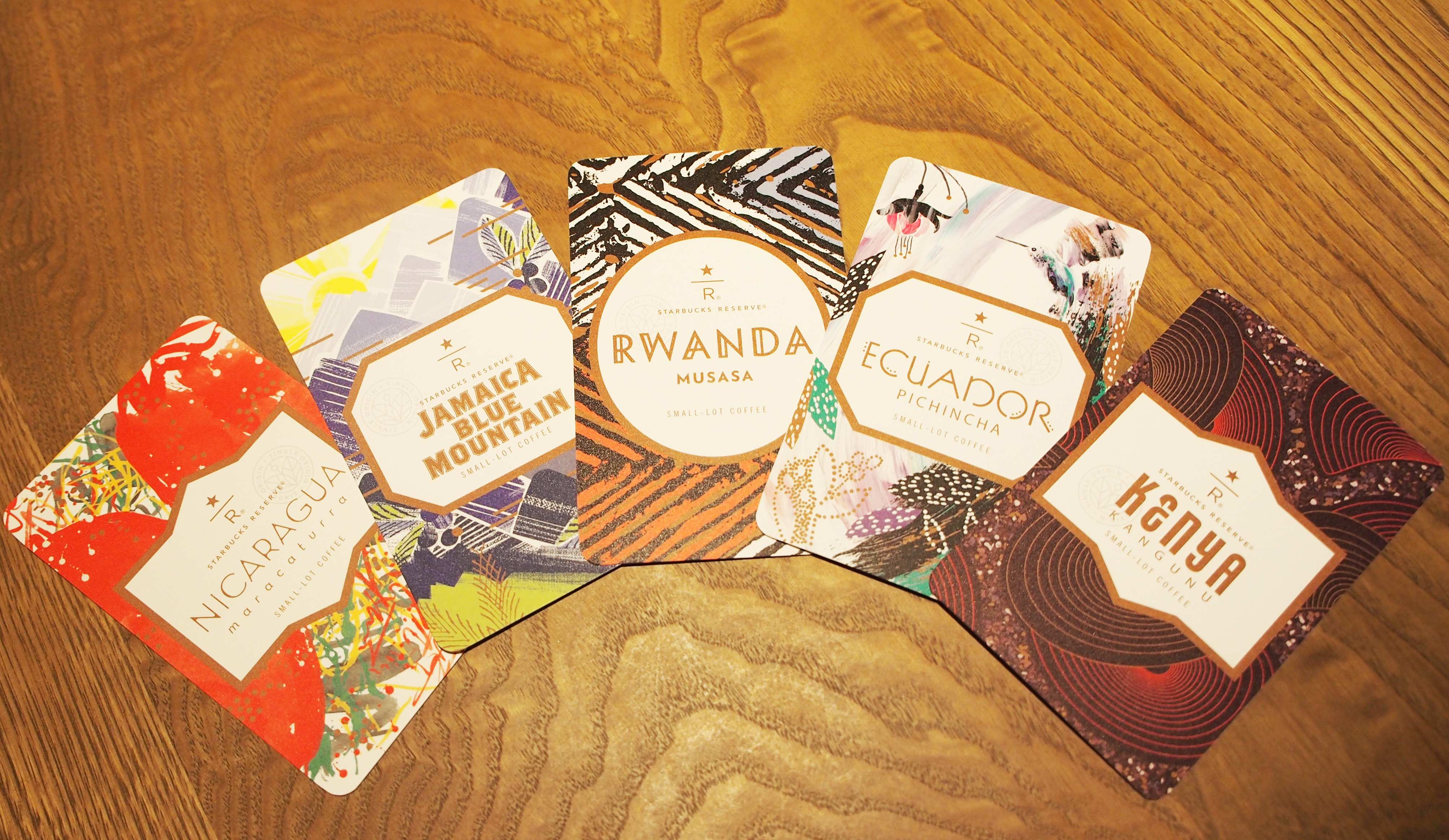 ▲左から「ニカラグア マラカトゥーラ」「ジャマイカ ブルーマウンテン」「ルワンダ ムササ」「エクアドル ピチンチャ」「ケニア カングヌ」。カードのデザインは、それぞれの豆の特徴を表しています。裏には、産地や、香り、加工法などその豆の情報を記載。味わった豆のカードを集めてコレクションしているお客さんもいます