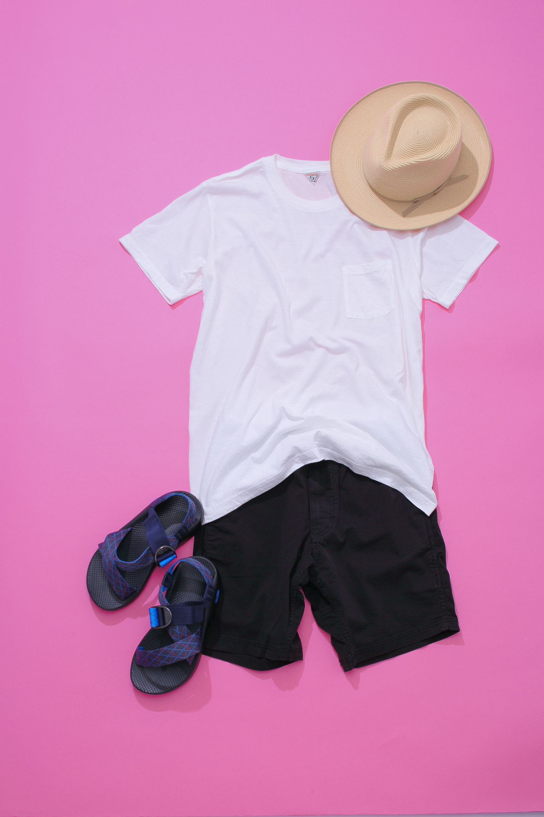 ▲ハット/STETSON(ステットソン)「STRATOLINER」(2万9160円)問: ステットソン ジャパン TEL: 03-5652-5890 Tシャツ(以下同)/フィルメランジェ(8100円) 問: バーニッシュ TEL: 03-3468-0152 ショーツ(以下同)/Gramicci (グラミチ)(8424円)/ジャケットリクワイヤード 表参道店 TEL: 03-6427-1961