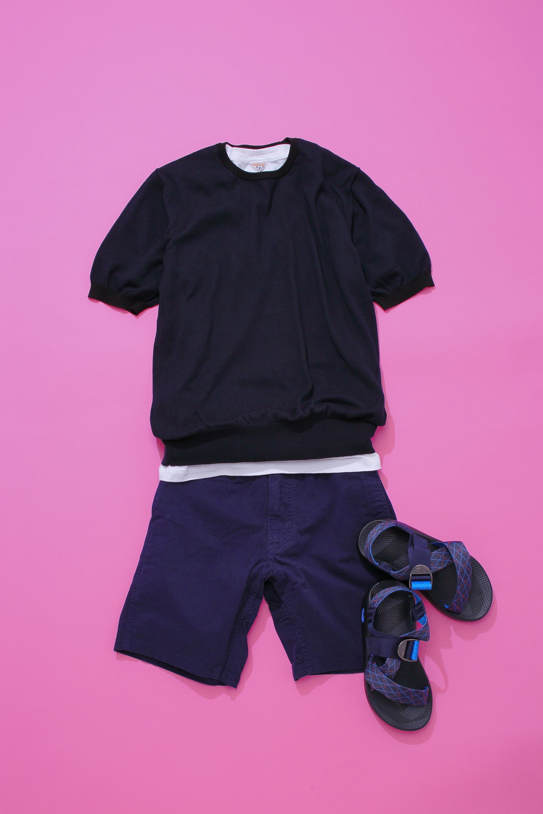 白Tシャツの上にサマーニットを合わせたコーディネート。一見、暑いのでは? と思いがちですが、そんなことはありません。縫い目が荒かったり、コットン素材を使用していたりと、ニットといってもつくりは夏仕様なので、快適に過ごせます。脇や背中の汗が気になる人は、上にサマーニットを合わせることでカバーできるし、汗をたくさんかいた時は中のTシャツだけ替えればいいので、汗かきさんにオススメのコーデです。