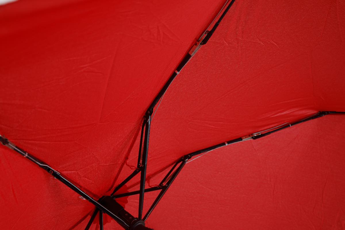 人が乗っても壊れない同社製の長傘に迫るほどの耐久性を確保し、強風にも屈することなく壊れて処理する煩わしさもない折り畳み傘です。ポリエステル製の生地には、雨水の浸透を防ぐためのテフロン加工が施されています。