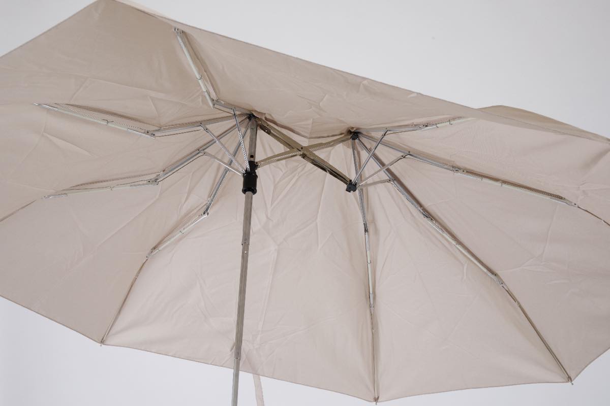 中棒(軸)の位置が中心から少しずれてるおかげで、自然に持ち手を握った際に後方側が広くなり、背負っているリュックや肩がけしてるバッグを降雨から守ってくれます。カラーはブラックとアーモンドの2色をラインナップ。