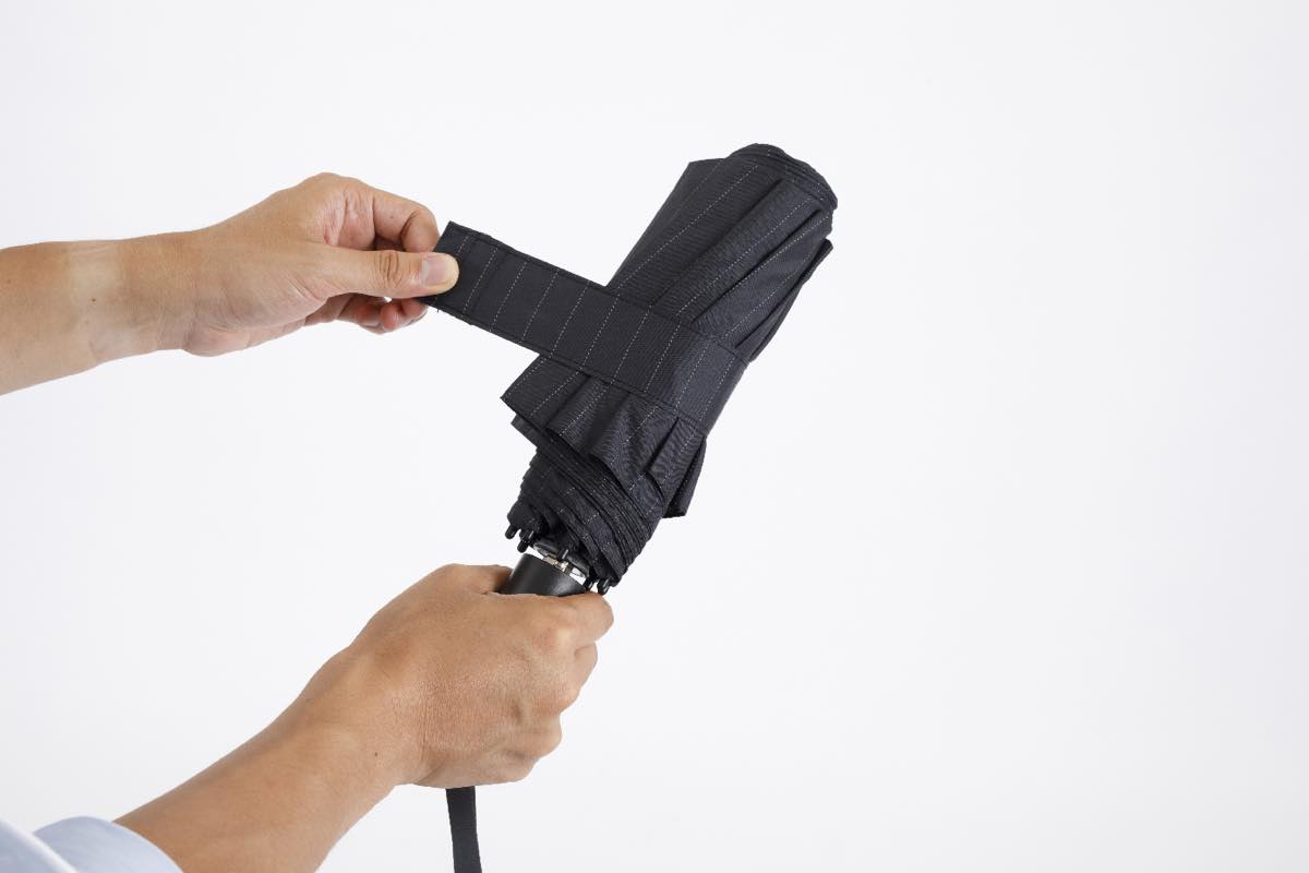 太めのストラップをひと巻きして素早くしまえ、使用する際は、持ち手の自動開閉ボタンを押すだけで簡単に開けます。