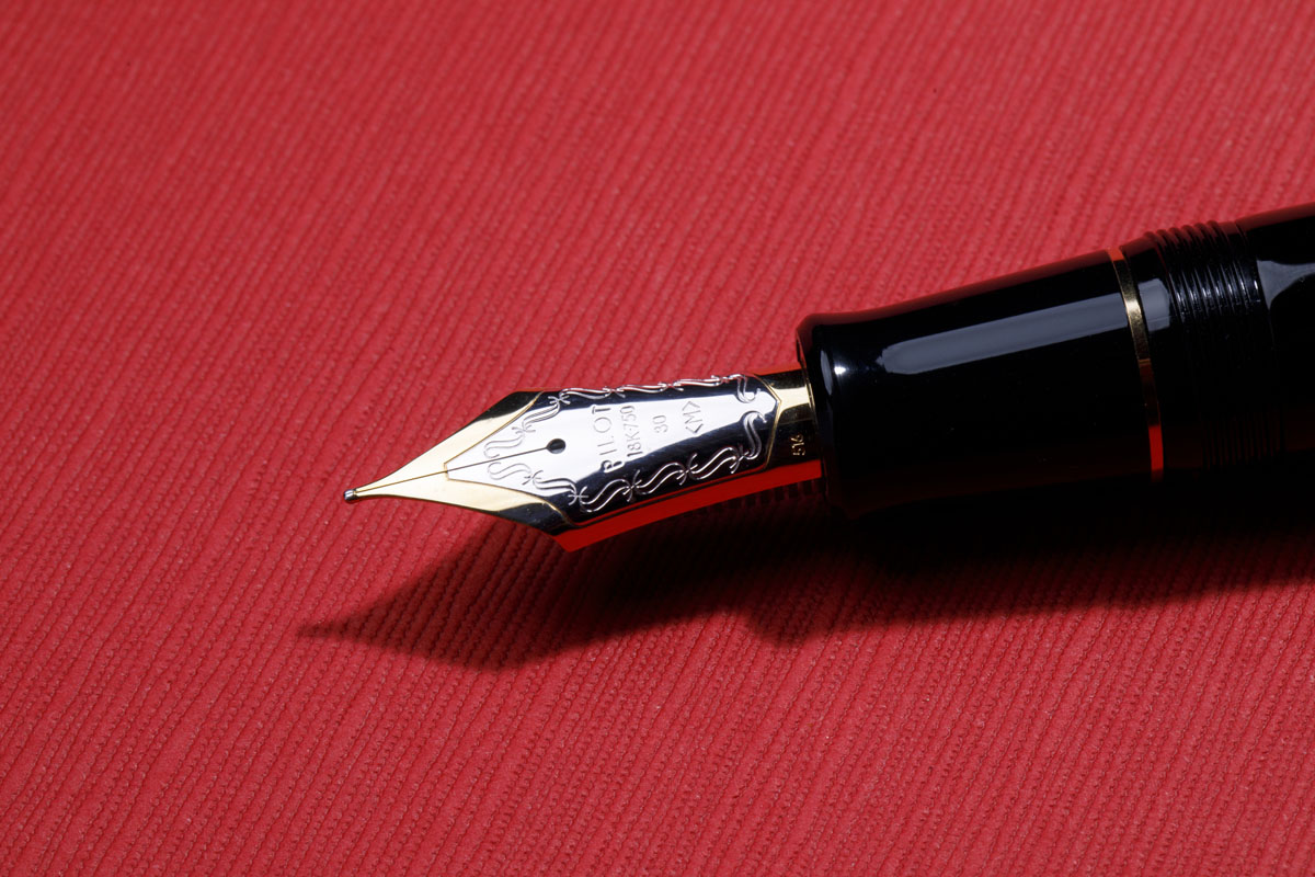 金を含有する18Kのペン先は、30号と大きいのが特徴。さらに、とても軟らかく高耐食性のロジウムメッキを施している。しなりの良いソフトなペン先と、手に馴染む太さの軸径とで抜群の書き味を実現した。表面は蝋色漆仕上げで高級感も高い。全長155㎜、最大径20㎜