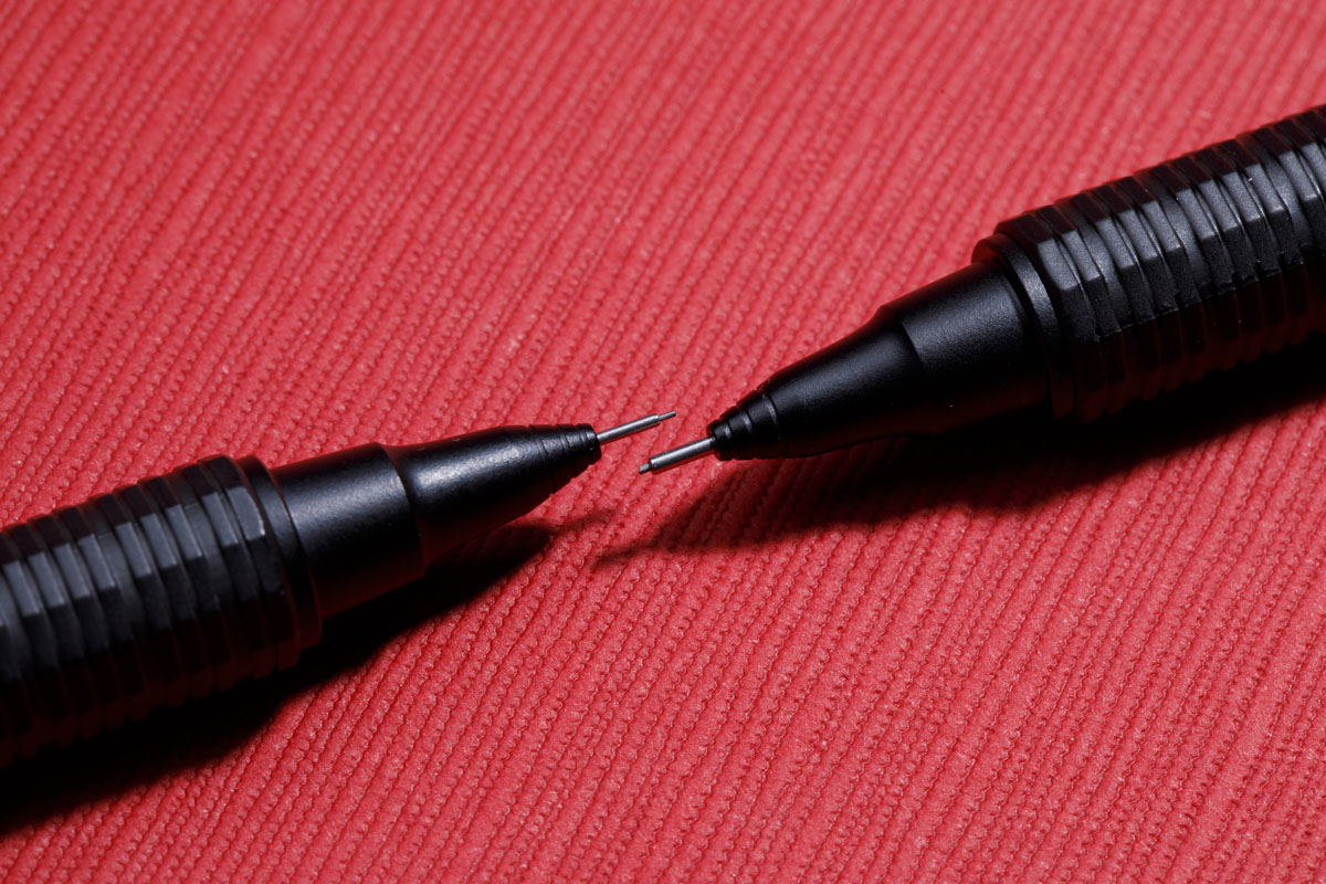 初めの1回だけノックすれば、あとは筆記時に芯が減った分だけ自動で繰り出されるシャープペン。先端のパイプが芯を守り、0.2または0.3㎜の極細芯でも折れにくい。軸の前方のボディ材に樹脂と金属粉とを混合した特殊材質を使用。軸色は「nero=黒」の1色のみ