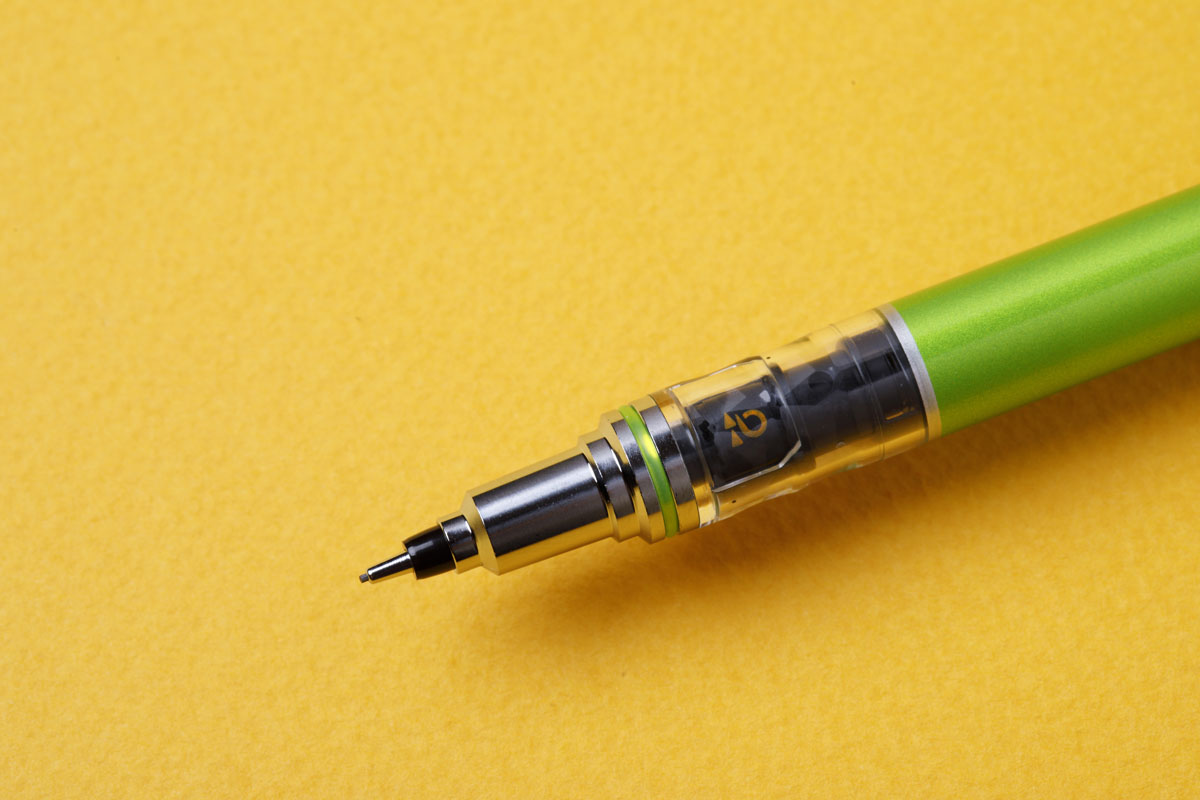 1画書くたびに芯が少しずつ回転し、20画で1回転する“Wスピードエンジン”を搭載。一般的なシャープのように芯先が偏って斜めに摩耗して極端に尖ることがなく、文字の濃さも太さも書き心地も一定を保つ。芯径は0.5/0.3㎜。軸色はネイビーや黒などの6 色(0.3㎜は4色)