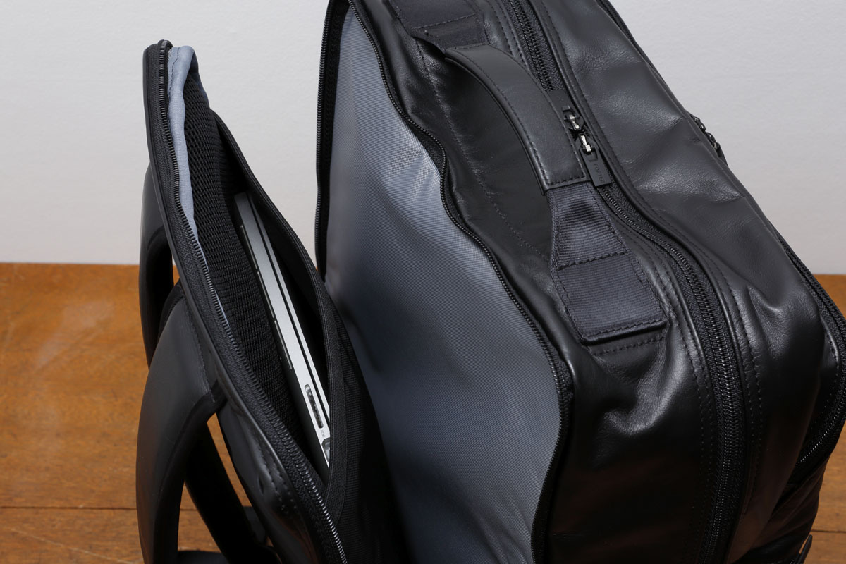 両手がフリーになるリュックは、もともとはアウトドアやカジュアル寄りの使われ方だったが、東日本大震災以降、ONでの使用でも人気が高まり、いまではビジネスシーンに合うモデルも増えた。レザー素材ならなおさらONにマッチするだろう。自転車で通勤する人にとっても、安全・安心にPCなどを持ち歩くなら、リュックが向いているだろう。