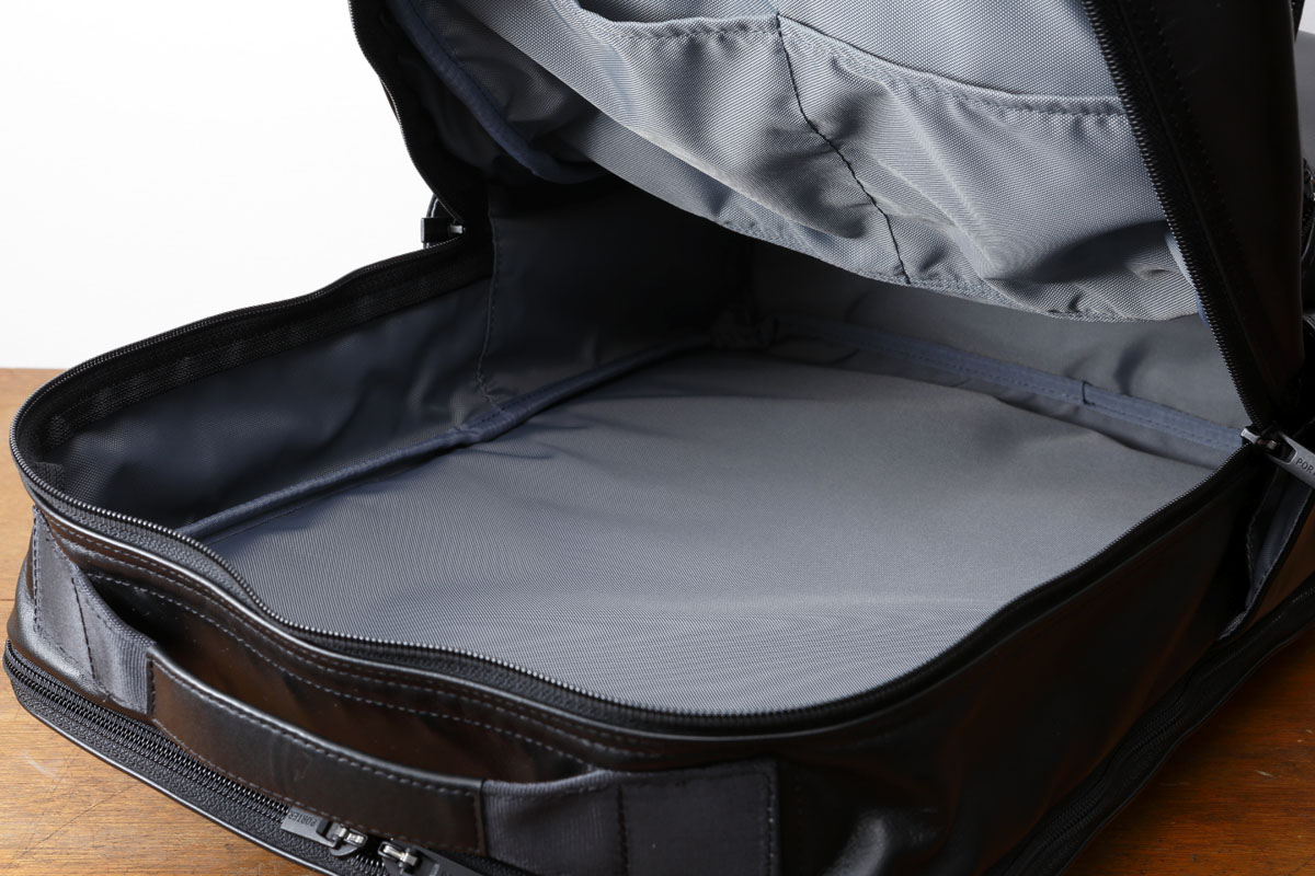 容量たっぷりの2層式。クッション材入りの15インチ対応PCポケットを備える。置いたときに自立するのも使いやすい。革はやわらかな風合いのステアハイドで、スコッチガード加工されており雨水を弾いてくれる。(サイズ:W290×H430×D160㎜)