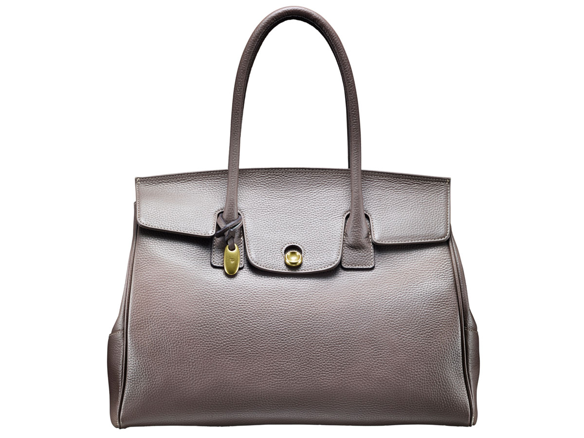 大きなフラップが特徴のクラシカルなレザーバッグ。革はしっかりとした厚みがあるシュリンク型押しレザーで、ふんわりとしたしわの入り方が綺麗。存在感があるバッグだ。(サイズ:W430×H330×D170㎜)