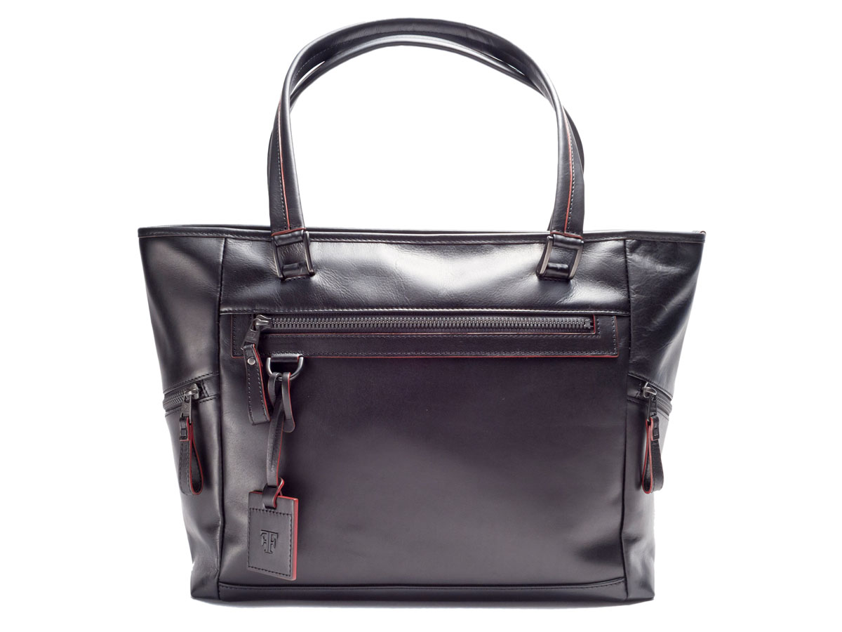 艶やかな質感で、トップが大きく開いて荷物の出し入れがしやすいレザートート。PC バッグではないが大型クッションポケットがあり、仕事でちょっと外出するときも十分使える。表と裏でデザインの異なるポケットも使いやすい。(サイズ:W340×H340×D130㎜)