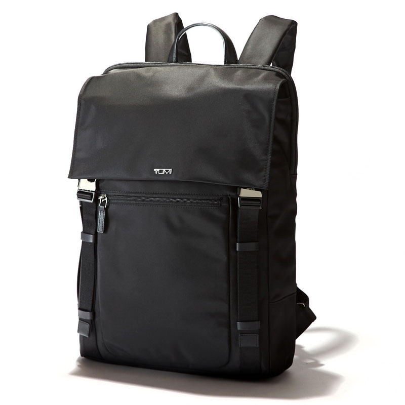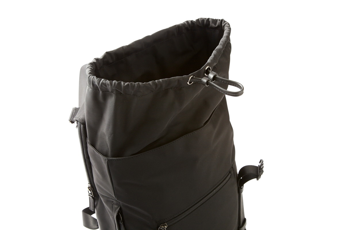 上質で耐久性に優れたライトウェイトナイロンを使用し、随所にレザーをあしらったバックパック。珍しいフラップ付きデザインが個性を放ちます。メインコンパートメントには、トップのドローコード開口部以外にも、サイドのファスナーポケットからアクセス可能。背面には保護パッド入りのPC用コンパートメントを搭載し、コード類をまとめるのに便利なメディアポケットやペンループを備えるなど使い勝手が抜群です。バックパックなのに、キャリーケースとのセットアップができる点も注目です!