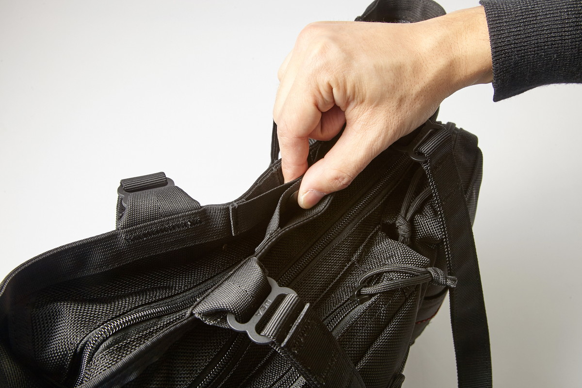 ▲メインコンパートメントの開口部はスナップボタン式。ブリーフィングのスナップボタンは当て布が付いているため閉めやすく、同時にバッグ自体の損傷も防ぐ仕様になっている