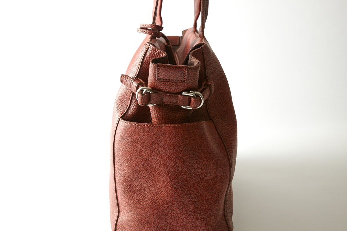 サイドのアジャスターにより、マチ幅を自由に変えられる新型トート。荷物の増減にスマートに対応できるため、毎日の通勤から1泊程度の出張にも使用可能。両サイドにはペットボトルまで入る大型ポケットを配置しており、使用頻度の高い小物に素早くアクセスできるのもうれしいポイント。バッグの素材使いも魅力的で、回転ドラムで自然なシボを表現したシュリンクレザーを採用。さらにシボ山のみを手作業で削り取り、陰影のある独特な色味に仕上げています。
