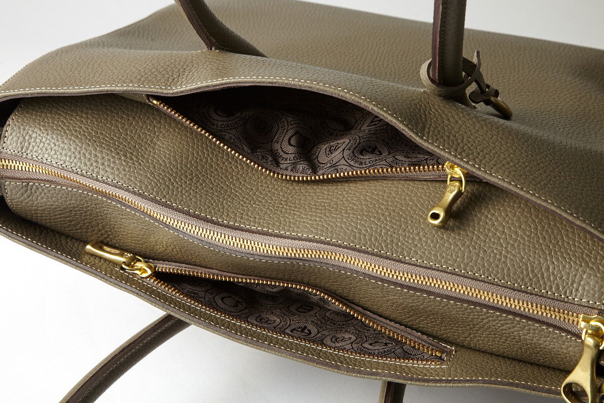 ▲収納性も高く、特にハンドルの根元付近のポケットが便利。ポケットの引き手にはそれぞれの目印になるよう、別々の真鍮鋳物のファスナープルを使用している