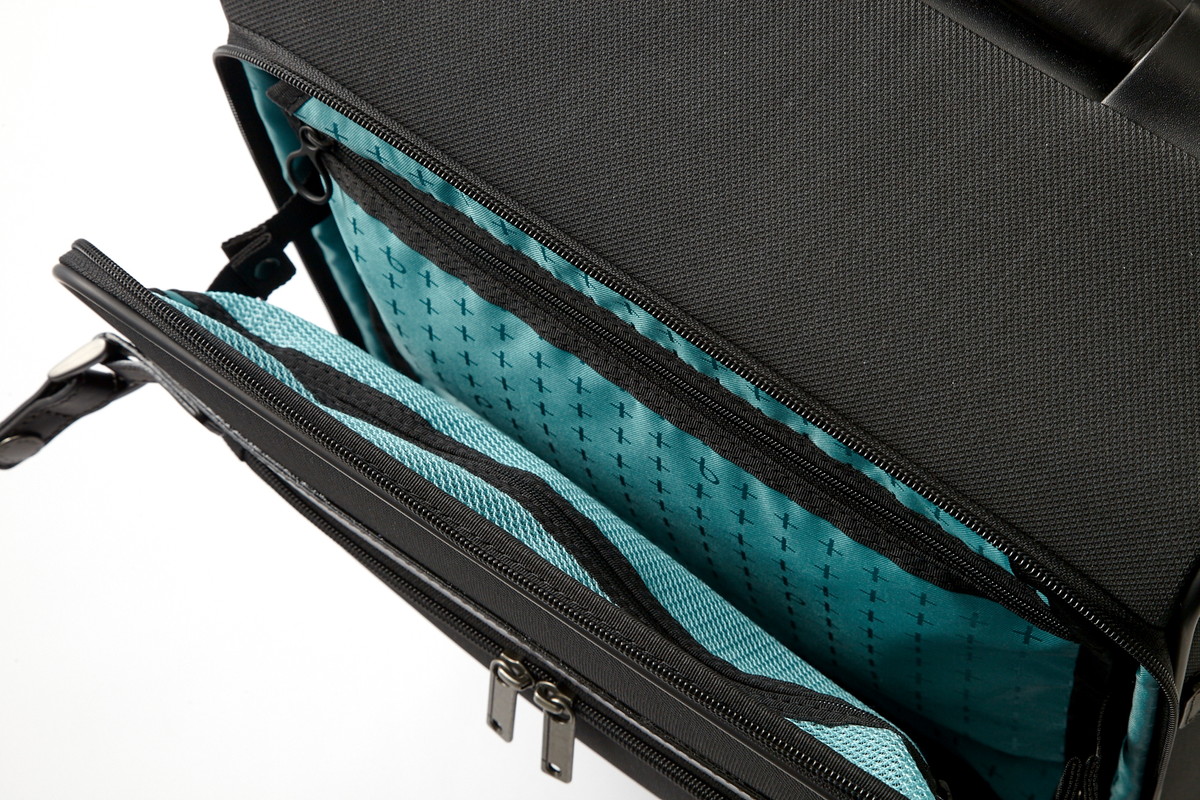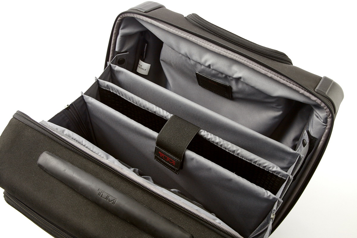 ▲コンパートメントは取り外し可能な蛇腹の仕切りが付いており、書類やファイルごとに整理して収納できる。まさにビジネスに特化したキャリーといえる